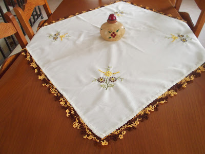Esta toalha fiz no verão adaptei um esquema de crochet ao tamanho do quadrado (que eram os guardanapos de uma toalha comprida ) desfiz o bordado que tinham e fiz este com ponto corrente que é o único que sei fazer.